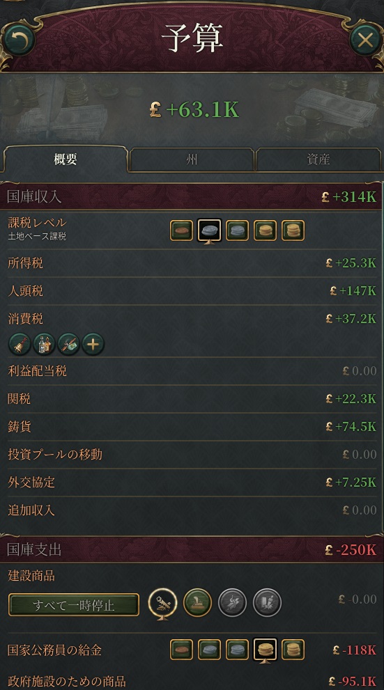 予算だが、とりあえず奉仕・酒・アヘンに税金を掛けた。