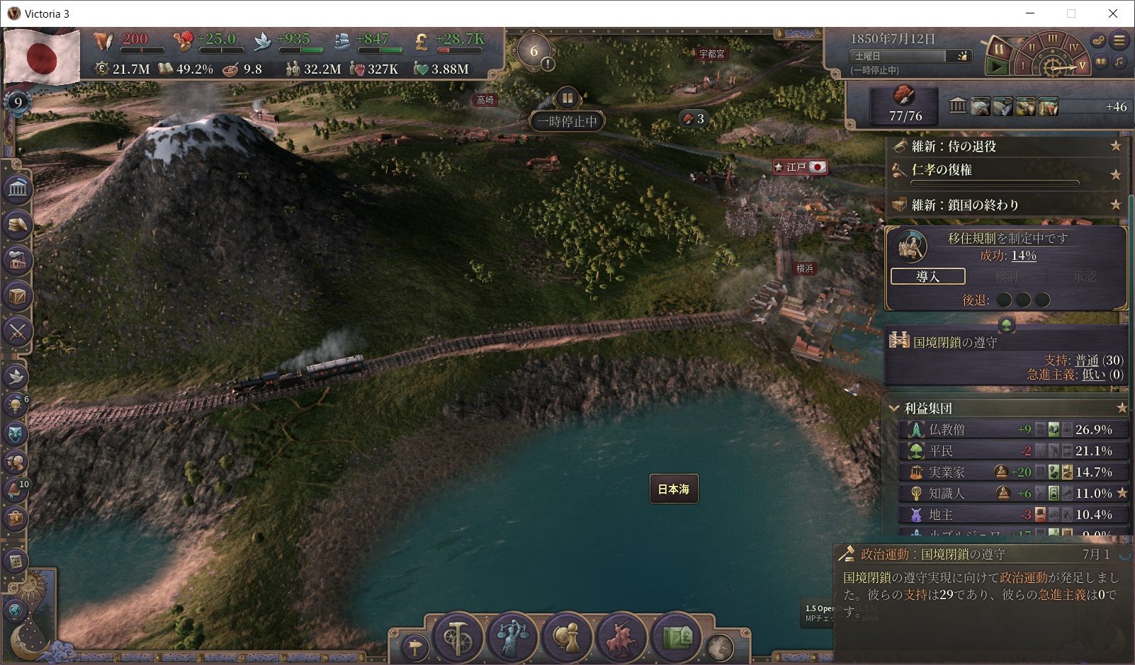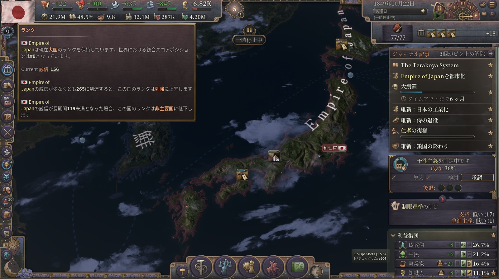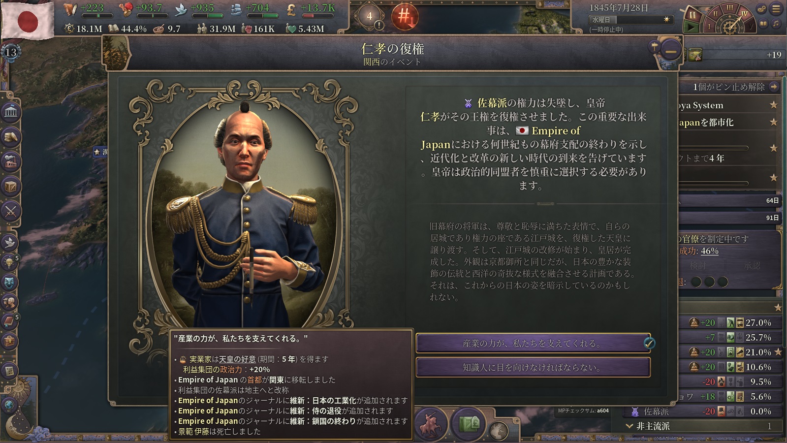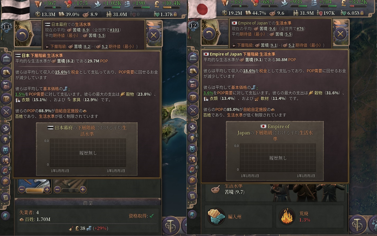GDP成長率は目覚ましいが、他はまだ停滞気味。東北・関東・中国・四国の元反乱軍領を中心に復興を進めていこう。