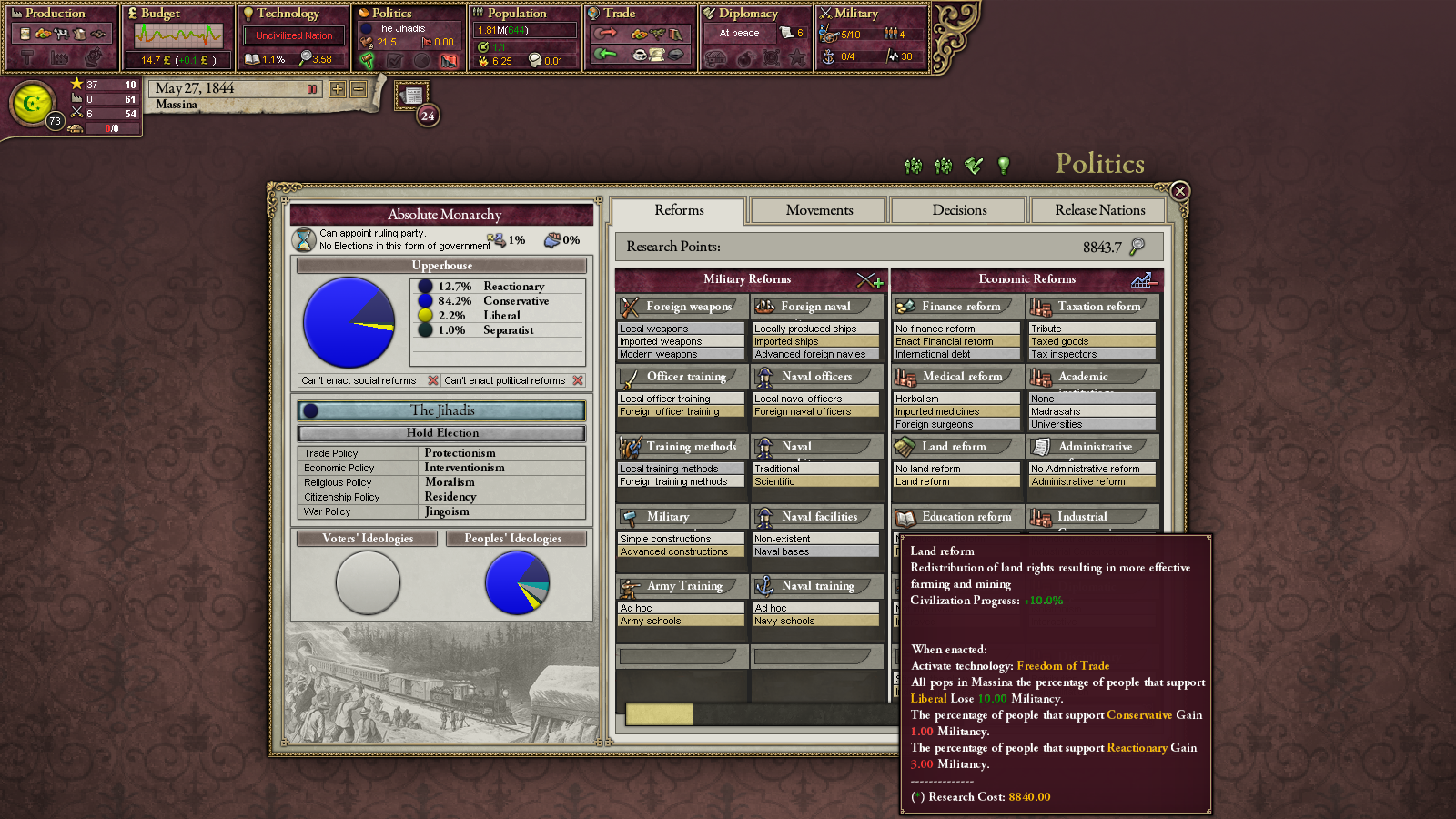 また、最初の研究では地租改正を実行、自由貿易(Freedom of Trade)を獲得。これは無印ほどの強烈さはなくなったが、それでもRGOが増える有用な研究である。