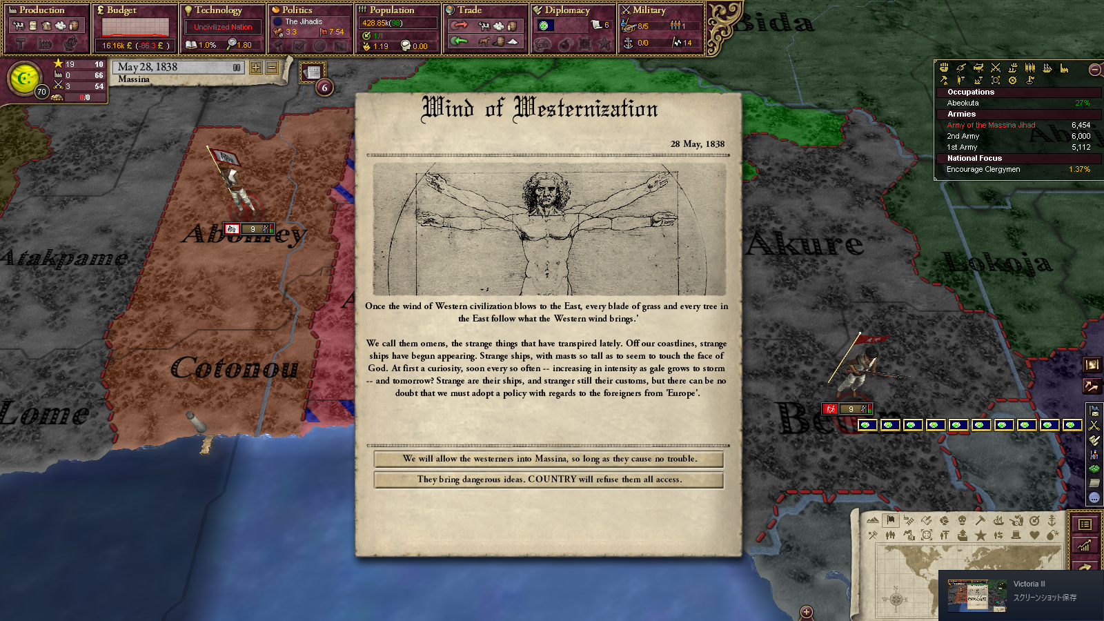 オヨ併合中に西洋文明を受容するイベントが発生。承諾。