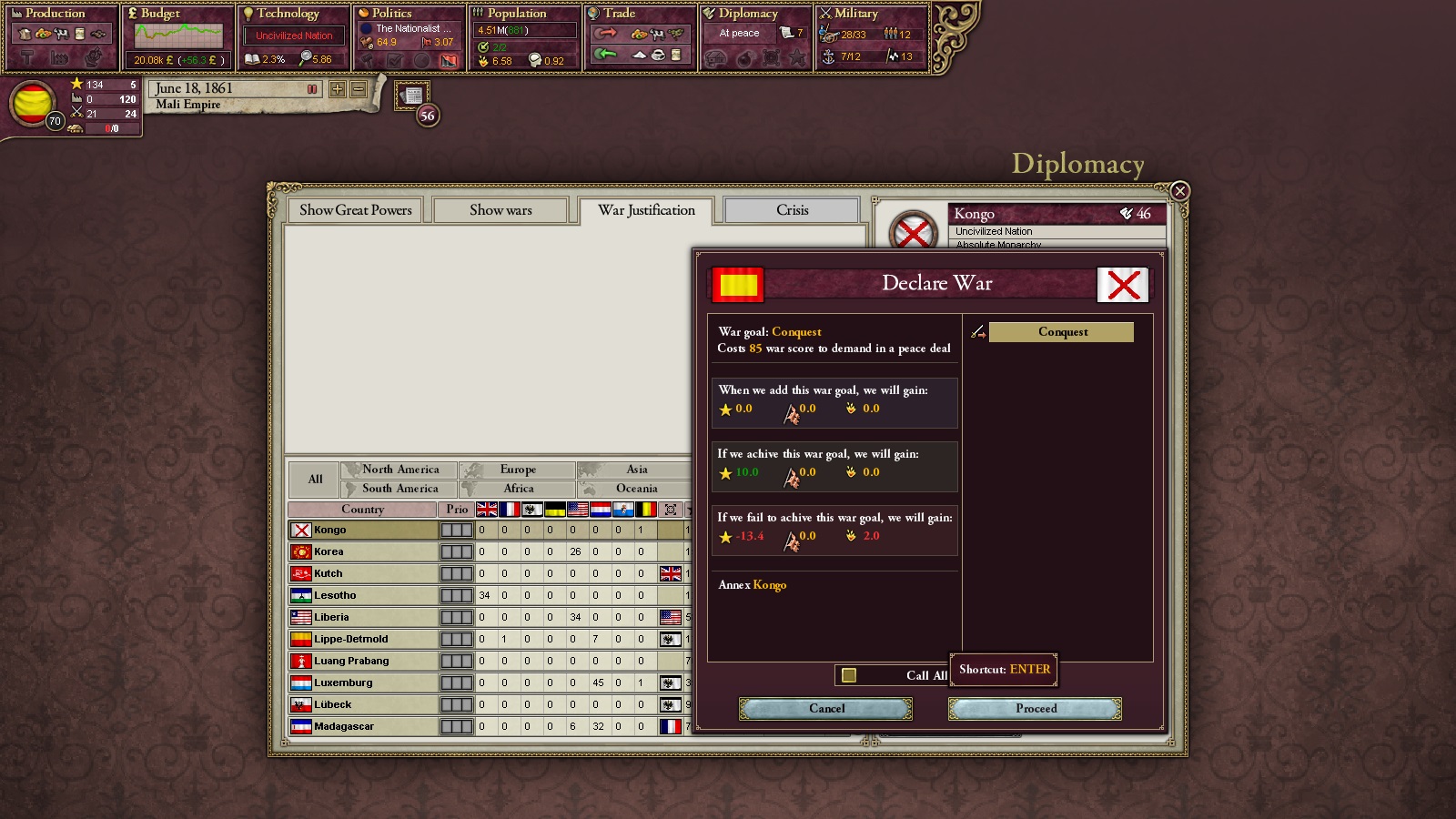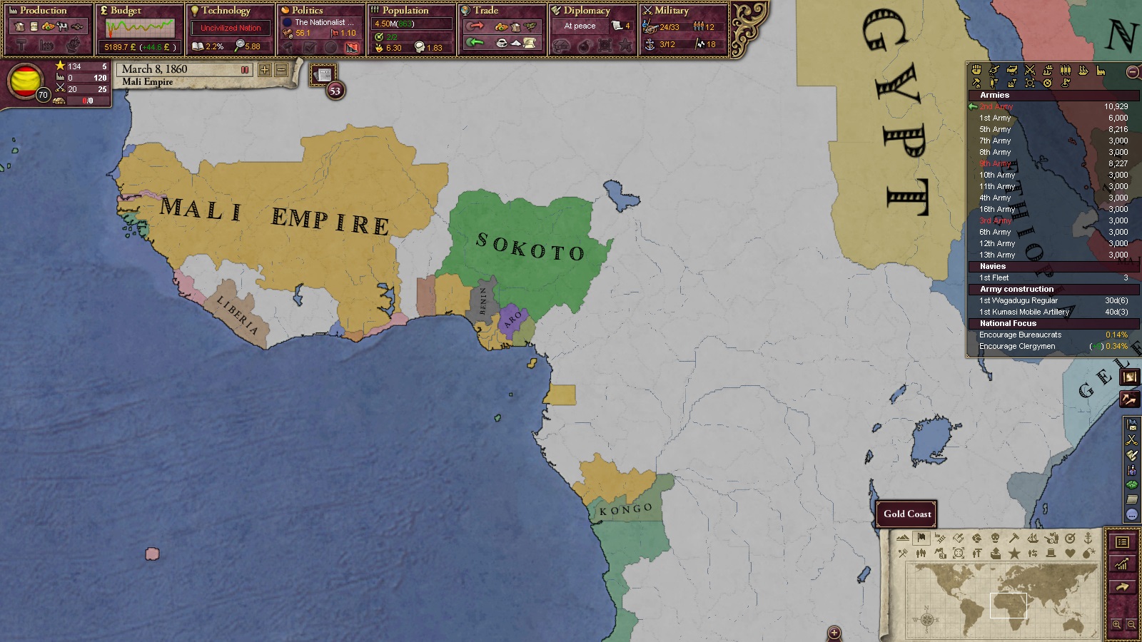 その後、アシャンティに宣戦布告し、ついでに領土を1つ要求し、アシャンティを消滅させた。その間にRehabilitationの研究を進め、文明化度は60%にまで達した。