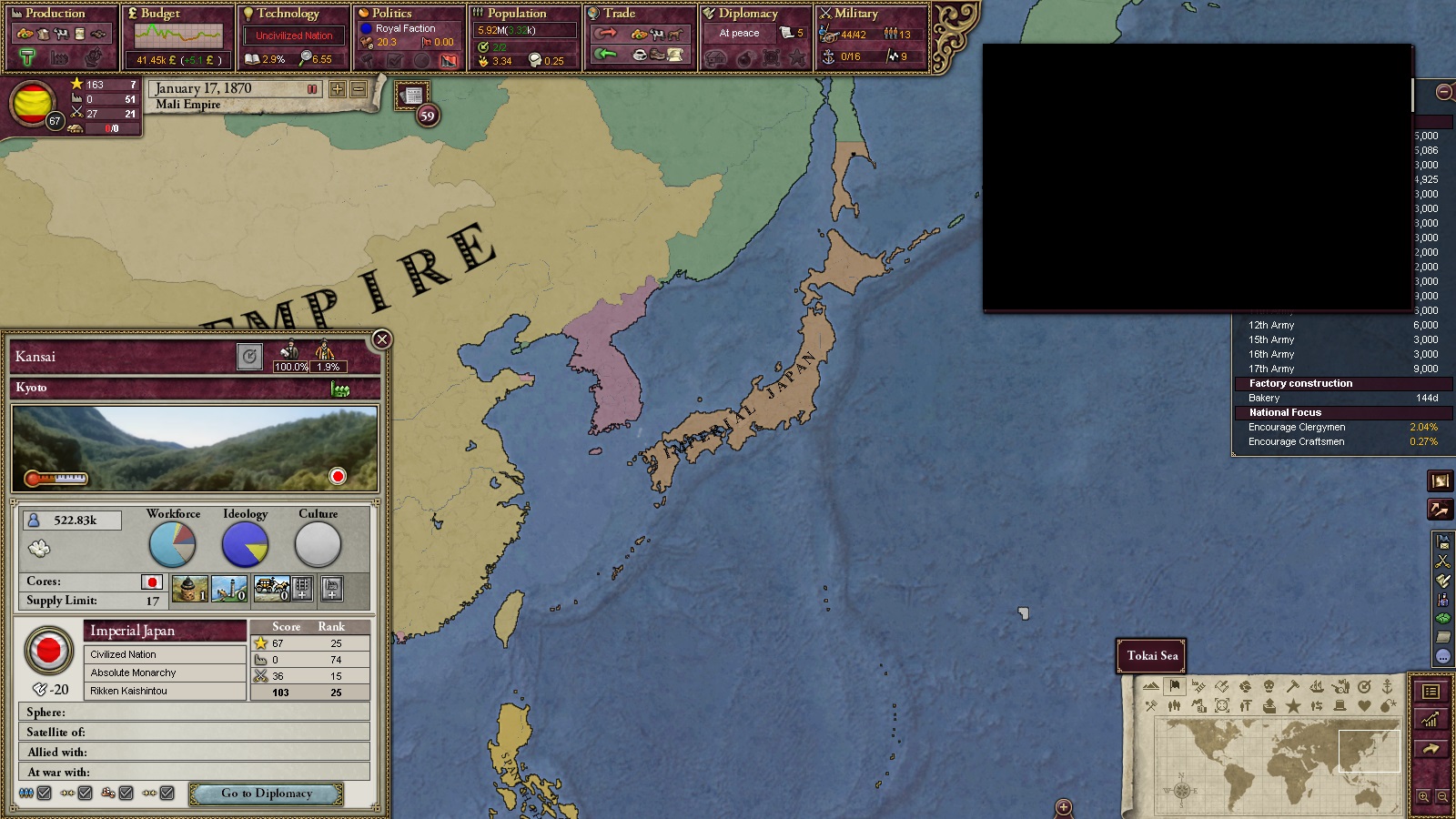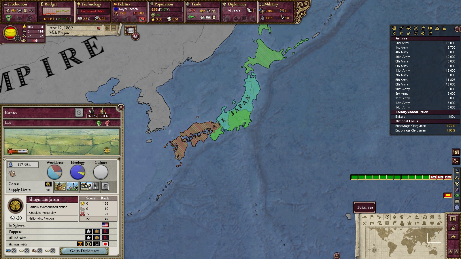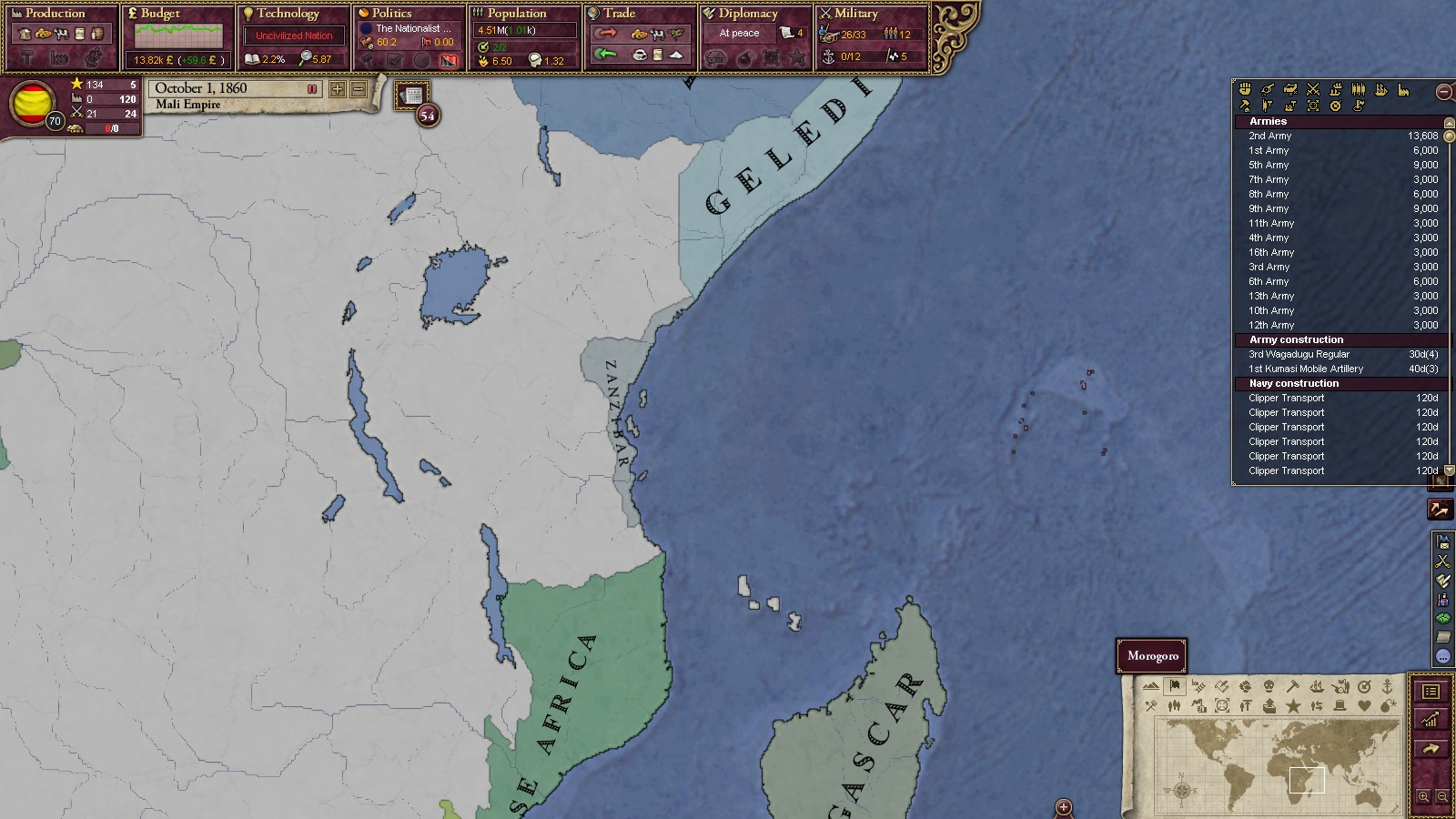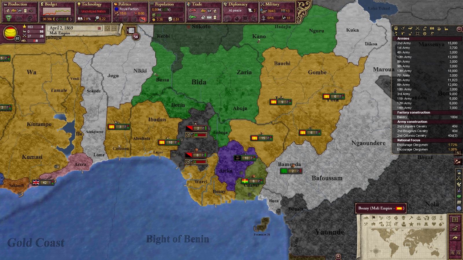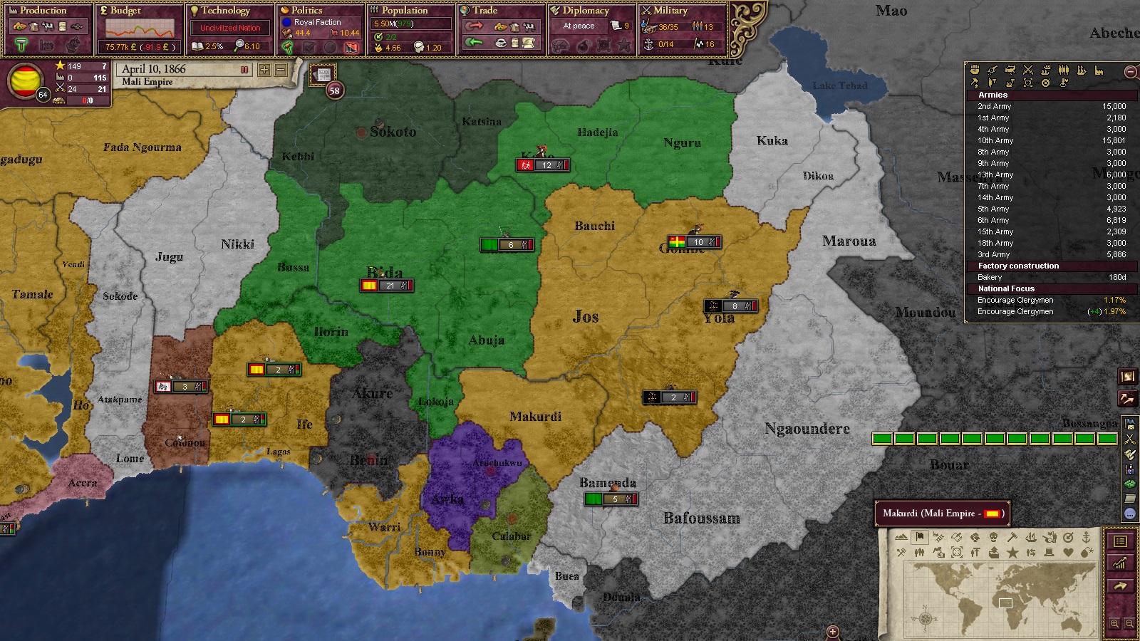 1866年、ソコトから2ステートを割譲、研究点2000点を獲得。基礎化学の改革を実施。文明化率は70%まで来た。1868年にはダホメを併合、研究点900点を獲得。セメント工場を建設開始。