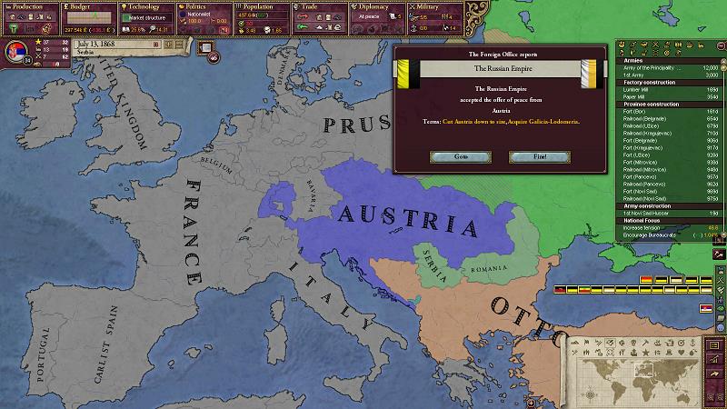 プロイセンと闘ってもこっちには旨味がないが、オスマンとの戦争の時にロシア同盟は必要なので放置。完璧押されてるけど。