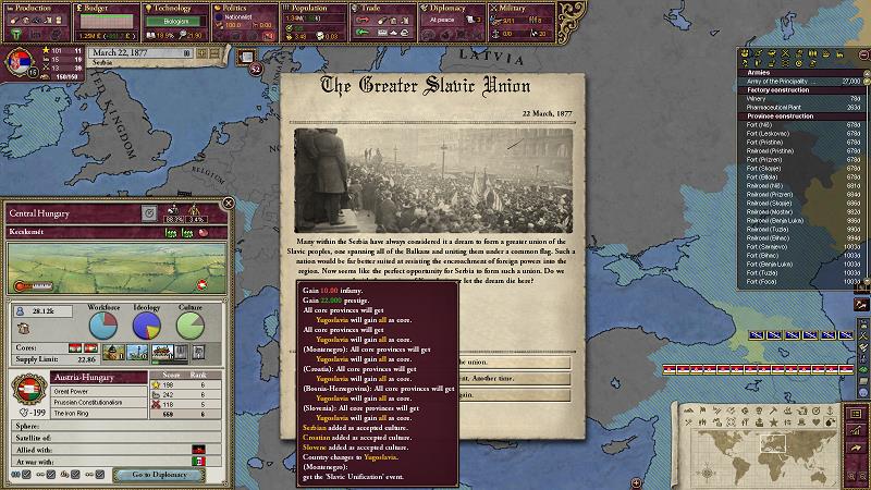 1877年3月22日、「The Greater Slavic Union」のイベントが発生、国号も「ユーゴスラビア」に変わる。オーストリア領のスロヴェニア・クロアチア全域も中核州になる。