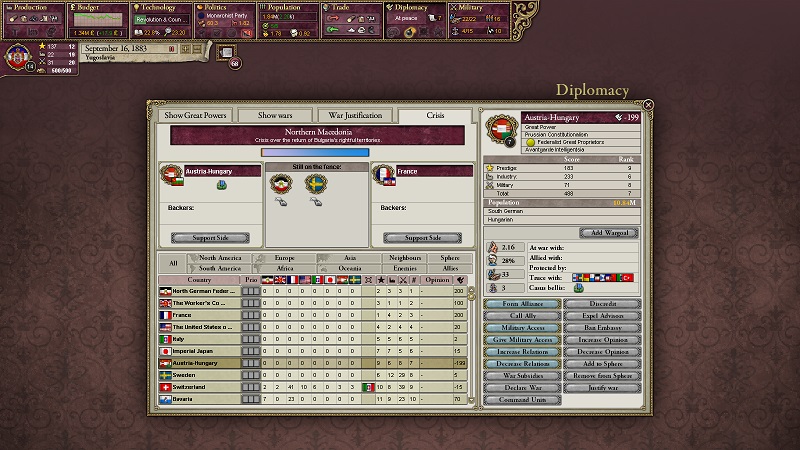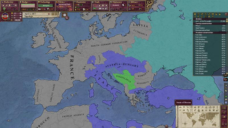 1883年9月、北マケドニアで危機が発生。ブルガリア側に墺洪帝国が、我がユーゴ側にフランスが付いた。