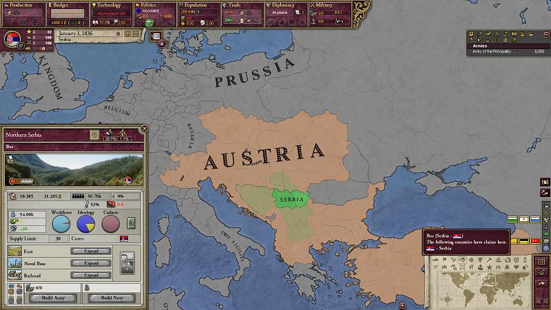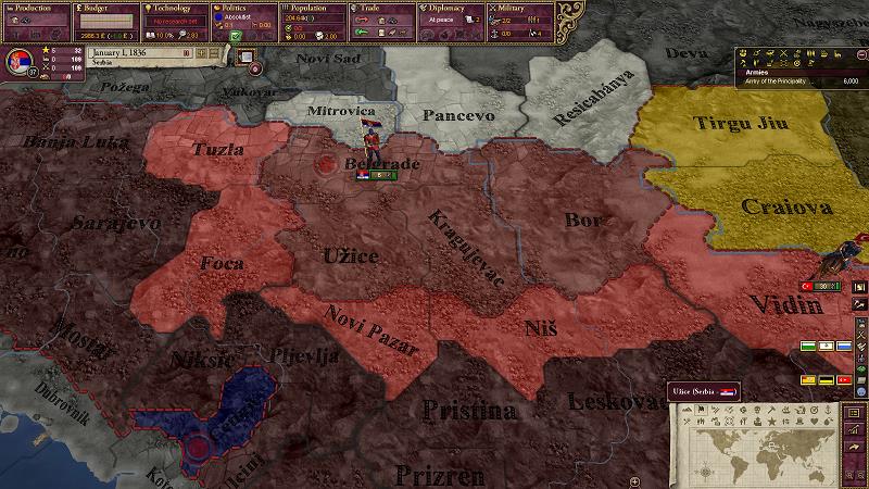 ミロシュ・オブレノヴィッチ率いる第二次セルビア蜂起の結果、1459年にオスマン帝国に滅ぼされたセルビア公国が、再びこの地に復活したのは1817年のことである。その後、1830年には自治を勝ち取る。独立時の当主、オブレノヴィッチ家による世襲も認められた。しかしながら、中央集権化を目指すミロシュと、従来からの村落自治による分権的体制を維持したい村落のリーダーとの対立が激しく、国内政治は混乱を極めていた…