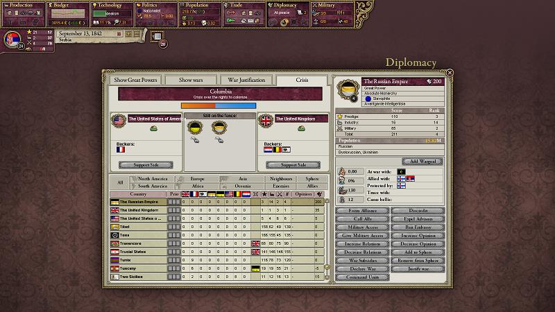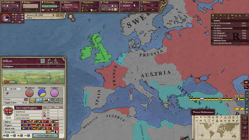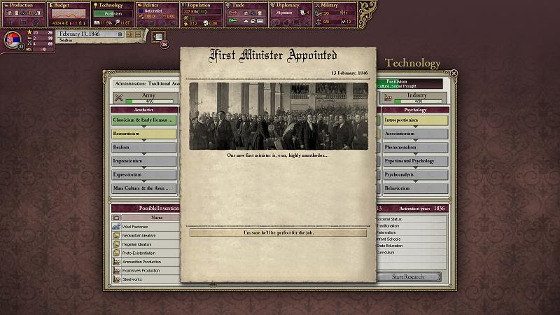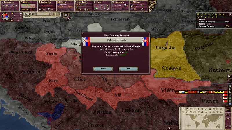 1838年7月11日(スクショは13日)、マルサス主義の研究が完了。次は自由貿易(Freedom of Trade)の研究へ。無印ほどの効果はないものの、それでもRGO+10%は大きいし、教育効率にも好影響を与える。