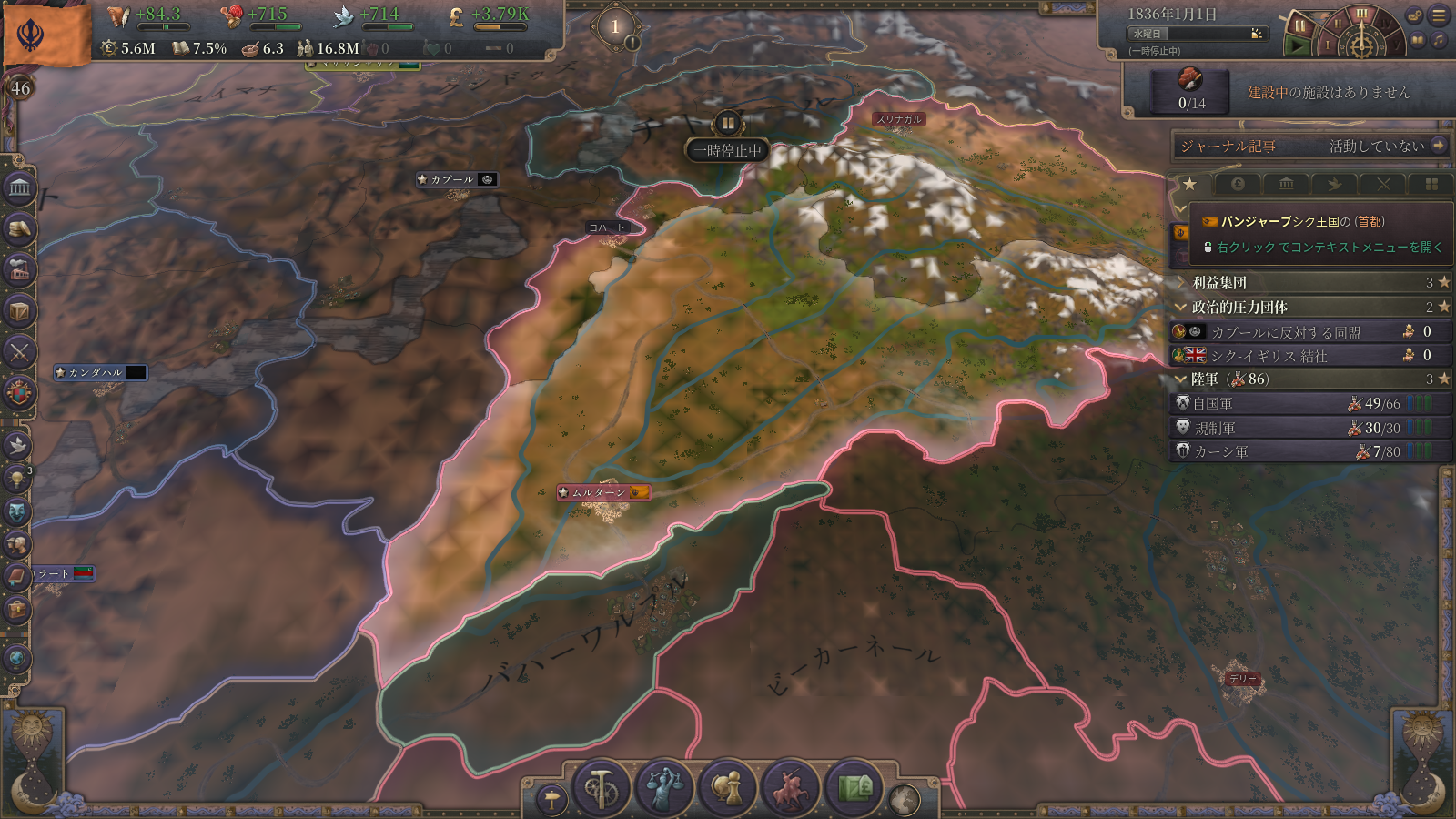 耕作地確保のため、バハーワルパル・チトラールは早めに併合したい。シンドも早めに併合したい。英仏が守護になっていた場合は防衛協定を組んでからか。